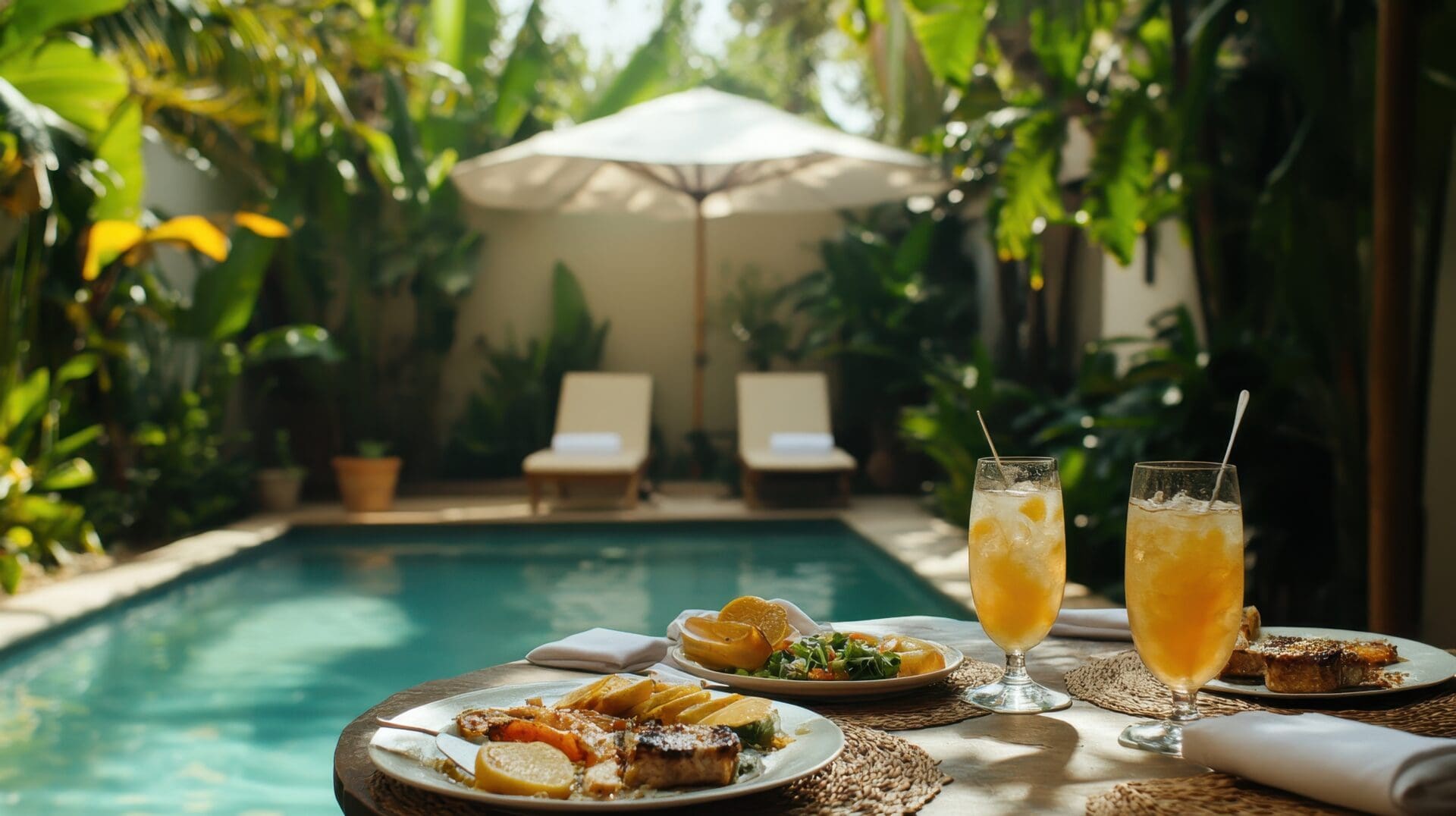 A tropical beach scene with three colorful kayaks or paddleboards resting on sandy shore, surrounded by lush greenery and palm trees, with turquoise ocean waves and a forested island in the background
